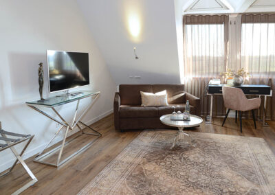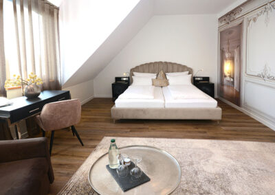 Suite mit Blick auf ein Doppelbett mit Wandbild in warmen Brauntönen